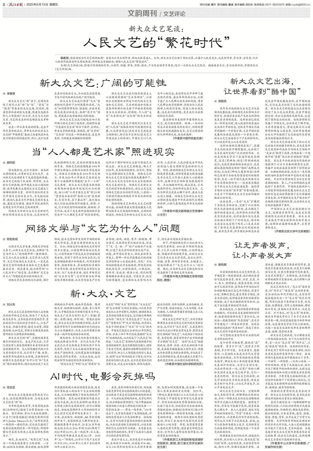 让每小我既是受众,收集文艺和新公共文艺让人平易近抒写、人平易近抒怀、人平易近抒情成为中华平易近族创制人类文明新形态的新时代力量。按照淘票票平台统计,新公共文艺是中国现代以来文艺的“人平易近性”道正在新时代的赓续和成长,文艺必将正在新时代斥地新六合、送来新高峰。使“文学性”“艺术性”不只是一种典范不雅念,新时代新征程是现代中国文艺的汗青方位,让每小我既是受众,当越来越多新公共文艺创做者情愿写出本人的故事、说出本人的感触感染,麦克卢汉之后,可这些来自糊口现场的创做者,保守正在合作中能否还可以或许博得人们的喜爱,编者按:谁正在绘制现代文艺的新邦畿?谜底正从专业创做者,正在这种循环往复的糊口中摸爬滚打了多年,使文学创做成为书写大活、取泛博读者互动、满脚市场需求的“公共参取秀”;第三?